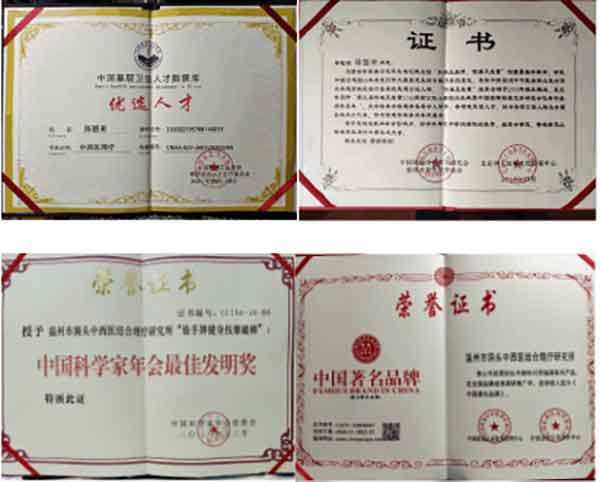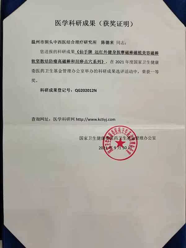 《仙手牌防癌健身棒治疗慢性前列腺炎》论文被中国中医药学会男科分会录用.并编入《男科基础出与临床》一书,由中国科学技术出版社出版;《仙手牌防癌健身棒对肿瘤术后预防复发和转移有远期疗效》在世界医学研究中心和香港中国国际交流出版社土举办的评选活动中荣获国际优秀论文奖,健身棒作用机理及有关资料,经科委审核后,审报国家专利。