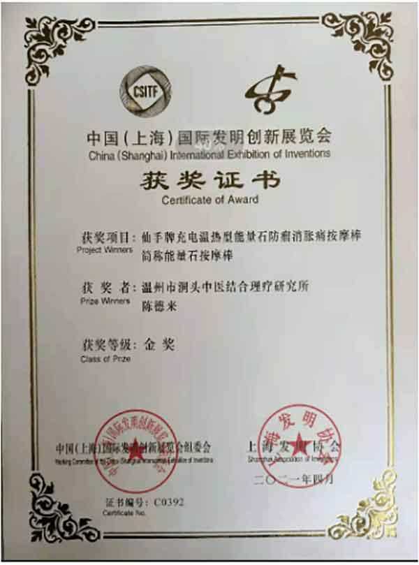 2、发明专利:保健梳。比保健鞋更经济实用;健身棒,是以人体背、腰、凹凸的自然生理结构和华佗夹脊穴、膀胱经的位置而设计的棒体内装有多个特制永磁和特定磁场的医疗磁铁.结合棒体的凸起轮状体而综合性刺激了华佗夹脊穴和足太阳膀胱经等经络及周围组织。健身棒滚压人体经络及软组织,能使处于休眠状态的组织细胞活跃后进入血液循环,形成网状细胞,籍以增强机体的免疫功能,加强新陈代谢时,促进微循环,祛瘀血,并能清除体内致癌和致器官、皮肤老化的自由基以及致疲劳酸痛的尿酸等各有害物质,以达到消除疲劳和健身及预防癌症之目的。 健身棒、健身鞋垫曾荣获97港澳国际鞋帽产品技术博览会即国际荣誉评奖会国际最高金奖;荣获中国第四届专利技术博览会金奖。