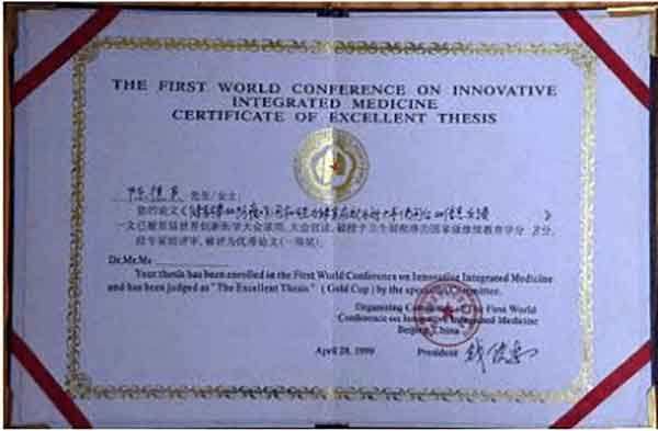 9、1999年4月27日《健身棒的防癌作用机理与健身疗效及近十年使用后信息反馈》论文,在北京中中国科学会堂“首届世界创新医学”大会上宣读论文证书经原卫生部钱信忠部长签名,论文内容被大会录用和交流及授予卫生部批准的***继续教育学分八分,该论文经专家组评审,被评为优秀论文金杯一等奖。