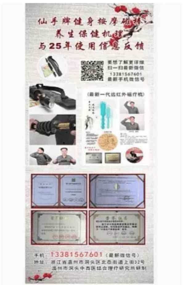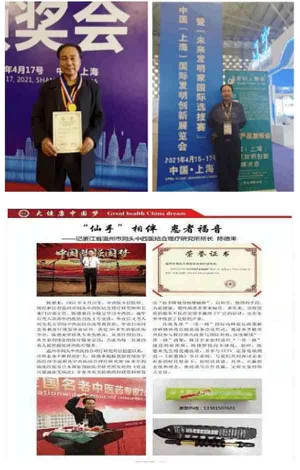 6、1995年争取得当地政府的支持,将原诊所扩建为现在的洞头中西医结合理疗研究所(浙江省温州市洞头区北岙镇上街32号老牌号39号)。自创办研究所后,先后研发了健身棒、健身按摩棒、健身按摩磁棒、磁梳等系列产品,并先后荣获多种奖项。